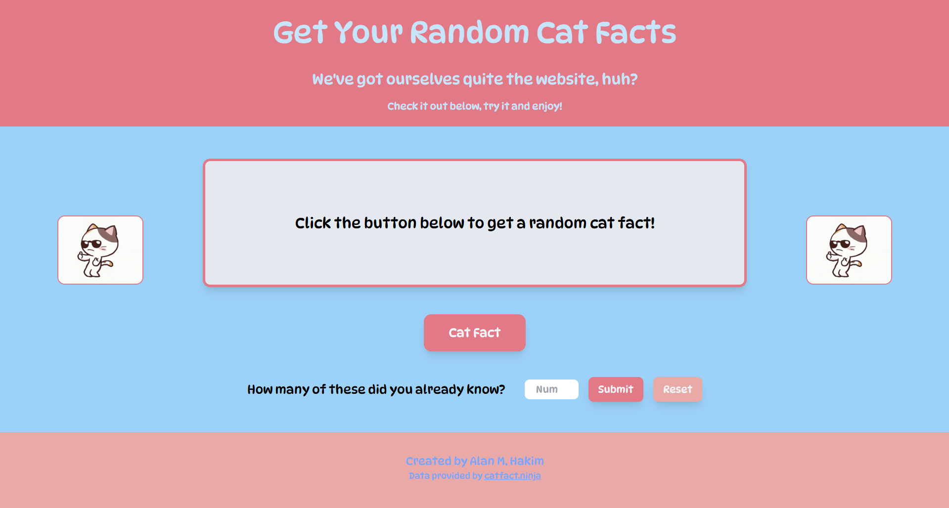 A fun app that generates random cat facts upon request. My first practical use of JavaScript!